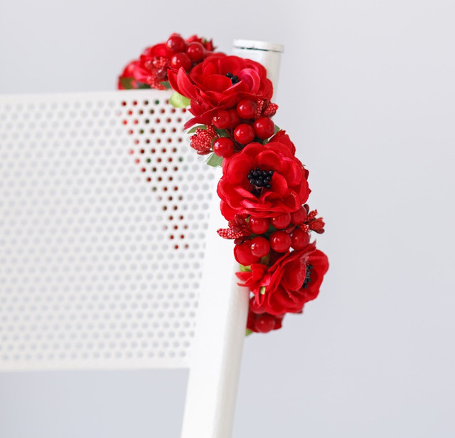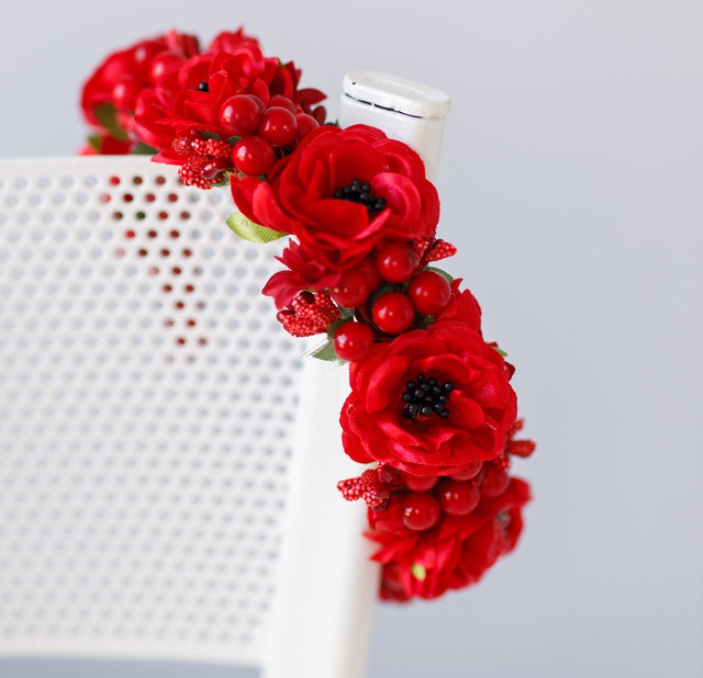 Обруч Феєрія з використання тканинних квітів, листочків, декоративних тичинок, ягідок та інших елементів декору.