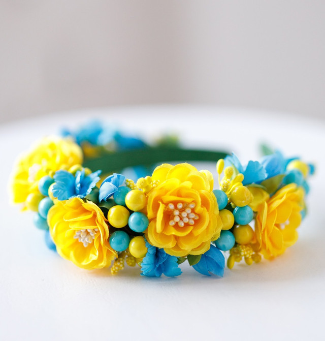 Обруч Феєрія з використання тканинних квітів, листочків, декоративних тичинок, ягідок та інших елементів декору.